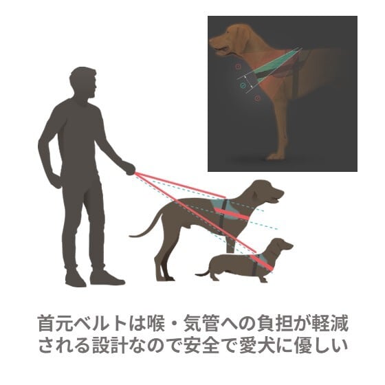 ①しっかりながら優しくフィットするチェストストラップが首より下側に力が加わるように設計されているので愛犬の首や気管に負担がかかりにくい形状