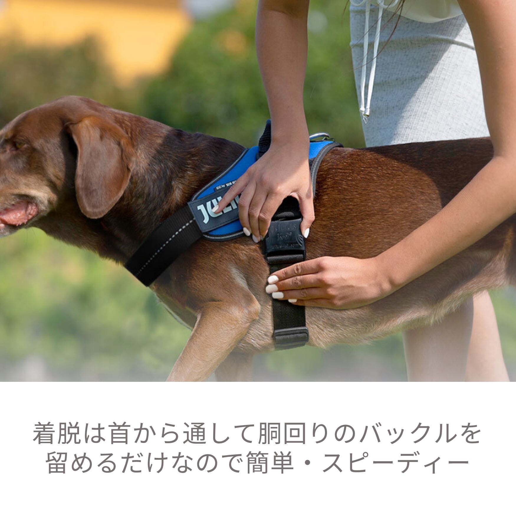 ②装着は頭を通して胴回りのバックルを留めるだけなのでとても簡単(足をあげる必要なし)